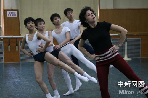 图为瑞典皇家芭蕾舞团艺术总监马德琳·欧妮与四个来自北京舞蹈学院附中的小演员,他们将在剧中扮演“小丑”。