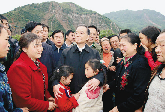 温家宝来到设置在学校操场上的群众安置点。他说,灾害无情人有情,通过这场灾害,人民更加团结,军民更加团结,干部和群众更加团结。我们的救援人员要到每个县、乡、村实施救援,党和政府还有全社会都会尽最大努力把被困在废墟中的群众救出来,把受灾群众安置好。据新华社
