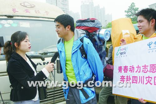 汶川强震后,团省委和省志愿者协会组织号召抗震青年志愿者赴灾区救援,与灾区群众同甘苦、共患难。获此消息,电信员工汪艺勇和黄宇鹏立即前往报名。在5月15日的壮行仪式上,二人现场接受了贵州电视台记者采访,他们激动地说道:“作为电信人能参加这次行动,我们感到很光荣,虽然是首次参与这样的行动,但一定会尽己所能、不畏艰难,积极投入到抗震救灾的行动中,帮助灾区人民共渡难关。”目前,两人已抵达绵竹,在县政府的安排下,开始紧张的救援工作。