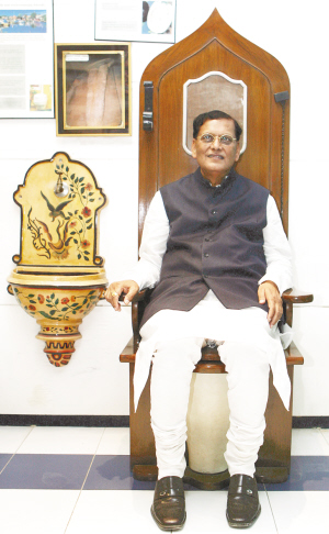 在印度首都新德里的苏拉布国际厕所博物馆,苏拉布卫生运动的创始人宾德什瓦里·帕塔克坐在仿照法国国王路易十四的王位制作的马桶上。新华社发