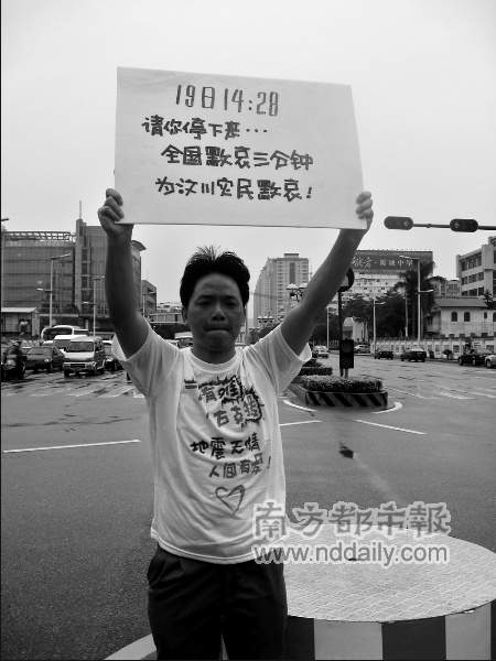 戴飞行一个中午都站在十字路口正中央,挺直地举着白色的泡沫纸板,上面写着“19日14:28请你停下来……全国默哀三分钟,为汶川灾民默哀!”雨下得有点大,他脸上的湿痕已分不清是雨水还是泪水。