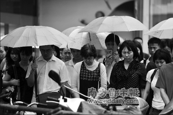 14点28分,天空阴郁,南海大道沃尔玛十字路口4个方向的车全都停下,喇叭哀鸣,低沉悠长。戴飞行紧抿嘴唇,举着纸板不时转身,面向各个方向鞠躬,车里的人也纷纷点头致意。