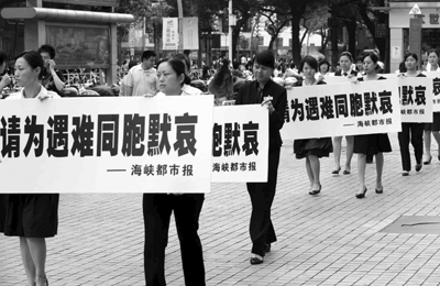 昨日,志愿者自发上街,为灾区遇难同胞默哀
