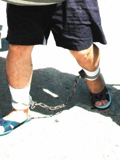 据称,绿岛监狱规定所有新收受刑人从入狱当天起得戴脚镣三个月,表现好才解除,因脚镣皆生锈,常有受刑人的脚磨破,细菌感染得到蜂窝性组织炎,腿肿得跟象腿一般,申请到台湾就医,机票及医药费还得自付。