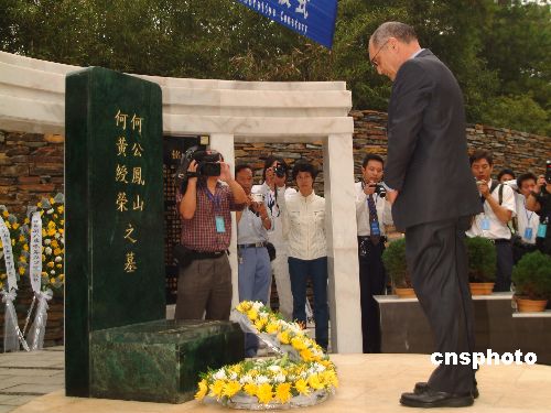 2007年9月28日,在二战中挽救了两千名犹太人性命的中国外交官何凤山博士纪念墓地在湖南省益阳市落成揭碑,以色列驻华大使安泰毅、何凤山女儿何曼礼等均前往益阳深切缅怀何凤山博士。二战期间,约有5万多名犹太人从欧洲来到中国的哈尔滨和上海避难。当时中国驻奥地利总领事何凤山,顶着德军的威胁,向犹太人发放签证,共救助了2000人左右,被世人尊称为“中国的辛德勒”。中新社发 郭国权 摄