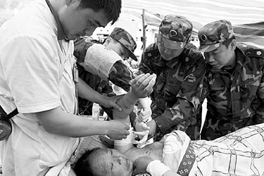 “伤员在哪里?快带我们去!”医疗队员放下背包,立即对灾民临时安置棚内的轻、重伤员进行巡诊、救治。