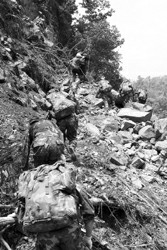 出发了,队员们才知道,说是山路,其实根本没有路。带路的老乡用柴刀不时劈砍着茂密的树枝和灌木,为大家趟出一条“路”。老乡说,这条路他也有三十年没有走过了。翻越山岭时,余震不断,多处出现山体滑坡,脚下都是大大小小的乱石,深一脚浅一脚,大家背着沉重的行囊,连大气都不敢喘一口。攀越一个陡峭的斜坡时,大家从坠石上爬过,脚下不断有碎石坠入悬崖,情形十分危险。在刘毅最后一个爬上去后仅仅两分钟,一次较强的余震发生了,斜坡上的石头纷纷坠落。突击队逃过一劫。