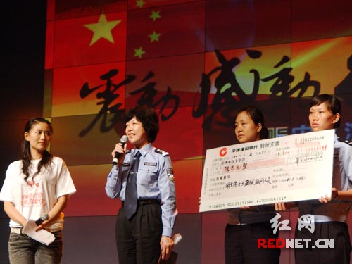 23日赈灾义演现场,来自湖南省女子监狱的17位服刑人员用朗诵加伴舞的形式将诗歌《孩子,赶紧抓住妈妈的人》表达得尤为感人。她们大多都是已为人母的服刑人员,虽然表演并不及明星们专业,但真切的言语以及舞蹈却感动了在场每一个人,博得了全场最为热烈的掌声。