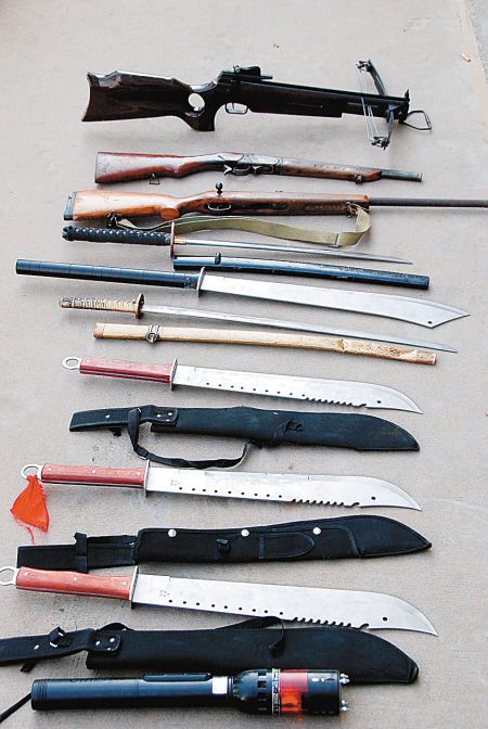 右图:警方缴获了大量枪支刀具。 文/图 记者 许森枷