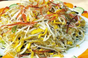 做法:豆芽洗净,切好备用;粉丝用温水泡软,切好备用;青、红辣椒去籽洗净切丝备用;蒜头去衣拍碎备用;火腿洗净,切丝备用;鸡蛋打开,搅匀煎成蛋皮,切丝备用;爆香蒜头,放入豆芽大火翻炒,然后加入粉丝、青红辣椒、火腿、鸡蛋丝继续翻炒片刻,最后以盐、酱油调味便可上碟。