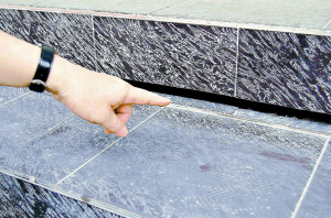 陵海路38号隔震住宅楼是一座8层住宅楼,有56间房屋,除一层对街商用外,都住满了人。记者站在这座隔震住宅楼前,发现街面到一楼商铺有几级台阶。而在台阶上方,沿楼房底部有一条宽约两厘米的长长的缝隙,手指头都可以伸进去。
