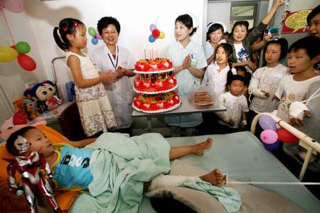 为小谢瑞付出爱心的不仅是医院的医护人员,在医院里帮忙的志愿者们也经常来探望这个讨人喜欢的孩子。小谢瑞病床边的床头柜上放满了志愿者和医生护士们送来的玩具、水果和饮料。住在小谢瑞对门的小病友——李琪,是红白中心小学四年级的学生,10岁的她在教学楼倒塌的时候摔伤了右手。李琪和其他能走动的小病友们经常到各个病房里“串门”,和那些不能下床的小朋友一起玩。李琪睁着大眼睛,真诚地说:“我们都希望谢瑞能早点好起来,下床和我们一起耍。”儿童医院的医护人员们在得知26日是小谢瑞和他的双胞胎姐姐7岁生日后,就决定要为他们过生日,让他们知道世界上还有许多爱着他们的人。开心的生日