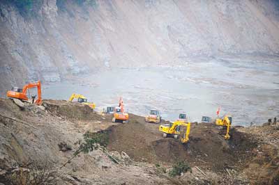 昨天,武警水电部队一总队官兵在唐家山堰塞湖附近紧张施工。随着大型机械的运入,四川绵阳唐家山堰塞湖排险工程全面展开。绵阳部署三套撤离方案