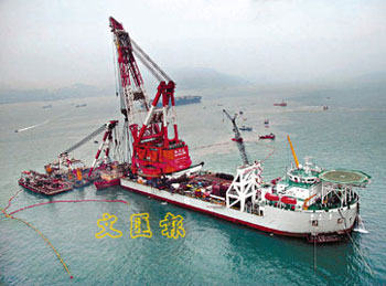 资料图:由中国交通部广州打捞局派出的大型打捞船“华天龙”,在香港水域小磨刀东面,成功将沉没的乌克兰补给船的烟囱及驾驶舱部份吊出水面。中新社发 邓庆乐 摄