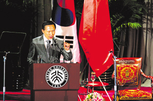 北京大学昨天又迎来了一位国家元首——韩国总统李明博,他是10天里第二个在北大演讲的国家元首。李明博在庄重而风趣的演讲中回顾了自己的奋斗历程,勉励青年要愈挫愈勇。他还在演讲中宣布,将改变访华行程赴四川震区慰问受灾群众,并承诺出席北京奥运会开幕式。