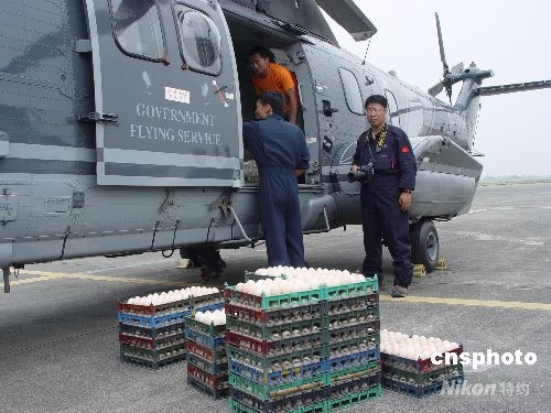 资料图:超级美洲豹”机组人员开始执行向抗震救灾一线运送物品。当天“超级美洲豹”首次执行任务,向战斗在抗震救灾第一线的解放军运送食品。香港政府飞行服务队“超级美洲豹”直升机,自23日抵达四川抗震救灾直升机基地后,积极准备,26日一接到基地指挥部命令给抗震救灾一线的解放军运送食品时,机组人员以最快速度接受任务并飞往救灾一线。中新社发 张钰昱 摄