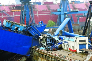 一位目击者说,事发时厂里正有一个班组在作业,可能是为船舱吊运钢构件,坍塌的龙门吊是600吨机组。