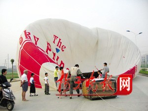 当天下午5点钟,记者路过横梁镇山东路时,看见新修的大路上有一只还未升腾的巨大热气球,吸引了不少居民围观。巨大的气球直径足足有10米,气球下面垂着一个吊篮,吊篮里站着一名穿飞行服的年轻人,他正操纵着吊篮内的喷火器,喷火器吐着两道火舌向气球里鼓热气。在充气时,为了稳住吊篮,他们还在吊篮上拴了一根绳子,然后系在一辆厢式汽车上,此外,还有两名男子拽住吊篮,防止在充气时晃动。可能是当时的风力比较大,还未完全鼓起的球身随风摆动幅度也很大。突然一阵风刮来,球身向西北歪倒,球身离地面只有几米高,就在此时,一辆拖拉机从这里经过,“喀嚓”一声,拖拉机上的角铁撕破了热气球,众人顿时目瞪口呆,吊篮翻倒在马路上,巨大的气球也泄了气,帆布飘飘荡荡落了下来,占据了大半幅马路,好在飞行员没有受伤。