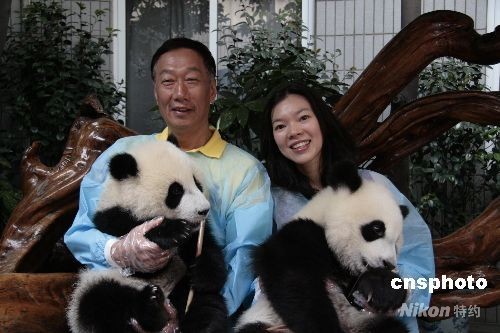 5月5日,台湾首富、台湾鸿海集团董事长郭台铭先生在成都大熊猫繁育研究基地参观时,决定出资600万元人民币,终身认养该基地3对大熊猫。这是成都大熊猫繁育研究基地自1987年建立以来收到的最高一笔大熊猫认养资金。中新社发 杨菲菲 摄