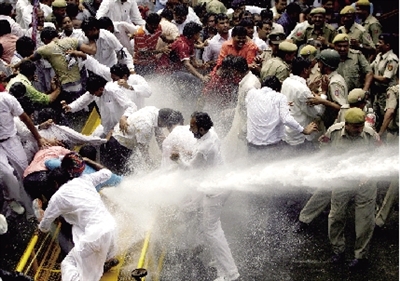 6月1日,印度警察用水枪驱散参加抗议的古贾尔人。新华社/法新