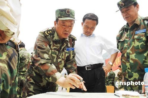 成都军区司令员李世明中将6月2日在灾区映秀组织指挥军地人员搜寻失事直升机。中新社发 陈文 摄