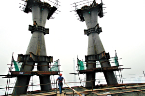 ②建设中的西塔第47层,巨大的核心筒每天都在往上长;不远处在建中的电视塔在雾中依稀可见。 倪黎祥 摄