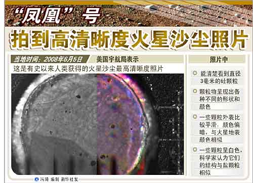 在美国宇航局网站展示的一幅照片中,一个直径3毫米的硅颗粒能够看得清清楚楚。据“凤凰”号项目小组介绍说,“凤凰”号着陆时激起了不少沙尘,因此一些硅等颗粒物扬起后下落,暴露在地表。光学显微镜拍摄到了这些裸露颗粒的精细照片,这是有史以来人类获得的火星沙尘最高清晰度照片。