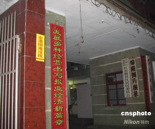 6月5日,位于唐家山堰塞湖下游的绵阳市主城区部分街道贴出“全溃坝淹没线”,提醒市民注意。据悉,如果唐家山堰塞湖出现全溃坝,该市主城区将有部分被淹没,涉及人口近百万。图为建设街一处标识,大约高出地面2.5米。中新社发 肖青 摄