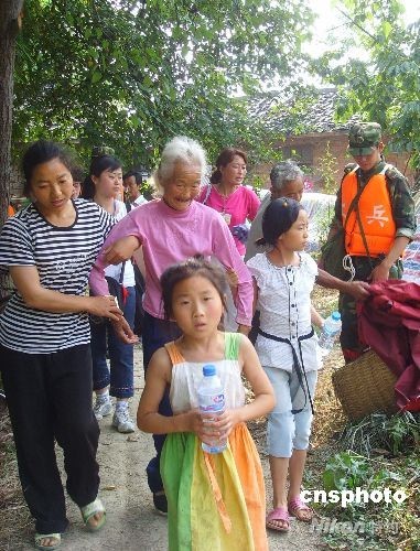 6月5日,驻滇某舟桥团200名官兵分为六个小组,在江油市九岭镇协助唐家山堰塞湖下游一旦全溃坝淹没线以下的民众撤离。中新社发 霍潺 摄