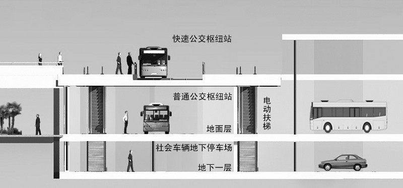 BRT如何搭乘?以农科所枢纽站为例,地下层为社会车辆停车场,一层设置了5000平方米的公交场站,二、三层设置便民服务商业设施。乘客到达第二层后,可以通过自动扶梯到达BRT车站的站厅层,需要乘坐BRT就买票进站,不乘BRT就直接通过天桥过街,实现了立体换乘。