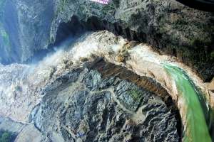 记者从远程视频监控系统的屏幕看到:浑黄洪水从唐家山堰塞湖坝后汹涌流出,沿着“U”形泄流槽倾泻而下,水势迅猛而平稳。由于冲刷效果非常明显,可以看到两侧山坡有较小的崩塌、滑坡。