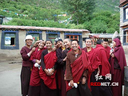 在山下,我们顺便还参观了僧尼们的厨房。在几间不大隔房围成的房间里,整齐摆放着一些青稞、小麦类的袋装粮食。几位年龄大一点的尼姑正在做晚餐,香喷喷的蒸汽散发着一种浓郁的酥油味,除了糌粑外,还有藏地农村有名的三件宝——萝卜、土豆、大白菜。在另一间房子里,几个小尼姑正在看藏语电视。见到我的突然造访,她们先是诧异,然后面带笑容的与我打招呼。