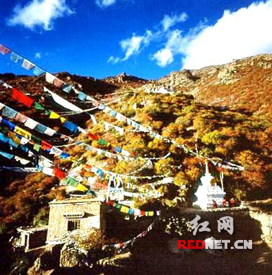 我们顺着山路艰难往上爬,这些由天然的石块或由路人踏出的土路陡峭难行,每隔几分钟,我们就停下来休息一下,缓解缺氧带来的气喘。山林里有各种叫不出名字的灌木、野花和树林,密密麻麻的一片。时至仲春,阳光格外明媚,春姑娘展开了笑脸,下午的阳关通过树林折射过来,温柔地抚摸着我,像慈善母亲那温暖的手。山上的小草破土而出,偷偷的从土里钻出来,嫩嫩的,绿绿的,把大地装扮成绿色。在青朴,到处都可以看见这一些生命力顽强的小草。在树林里,各种各样的野花互不相让,红的、黄的、白的、紫的,就像一个美丽的大花园。许许多多的蝴蝶和蜜蜂闻到了花的香味,都不约而同地飞来采蜜,在半空中飞来飞去。小鸟在自由自在欢乐地飞翔,唱出清脆悦耳的曲子。五色经幡随处可见,迎风飘荡。路边的石块上还可以看到藏文摩崖石刻,大部分是各种颜色和各种字体的六字箴言。我觉得,这里简直就是一幅江南的春色美景图。