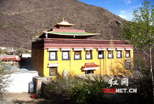 此时虽已近黄昏,但阳光仍是火辣辣的,烤得脸上有一种焦灼感。洞外不远处,我们看到了青朴最有名的寺庙——庵子庙。在阳光的照耀下,庵子庙顶金光闪闪。我赶紧打开相机,拍下几张照片。拍完照,我们还到庙内进行参观。里面的摆设与西藏其他寺庙没有区别,只是墙壁上的壁画都是与尼姑为主,里面摆放着观音等女性菩萨。在庙内,我们还见到几位尼姑在念经。在二楼的平台上,我们俯瞰到整个青朴的景色,远处网状的河道交织密布,河边青山隐隐,绿树幽幽,鸟语花香,一片世外仙境。加上这里因为路途崎岖艰险,与世隔绝,是修行的最好去处,我想这也正是此地能吸引了那么多人前来静修的主要原因。