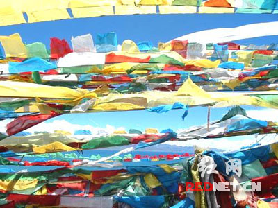 初到西藏的时候,随处可见挂在藏胞房顶、山口、江畔、河边,道旁以及寺庙等各处被认为有灵气地方的五彩旗子,藏族的朋友告诉我,这叫经幡,是因为这些经幡上面都印有经文,在信奉藏传佛教的人们看来,随风而舞的经幡飘动一下,就是诵经一次,在不停地向神传达着人的愿望,祈求神的庇佑。这样,经幡便成为连接神与人的纽带。其所在即意味着神灵所在,也意味着人们对神灵的祈求所在,寄托着人们美好的愿望。