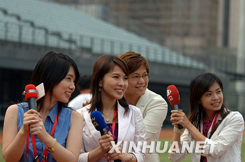 6月12日,几位台湾女记者在北京五棵松棒球场采访间隙拍照。新华社记者 金良快 摄