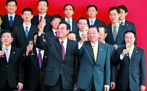 今天上午9时许,陈云林和江丙坤签署两项协议后一起举杯致意。安旭东摄 J130