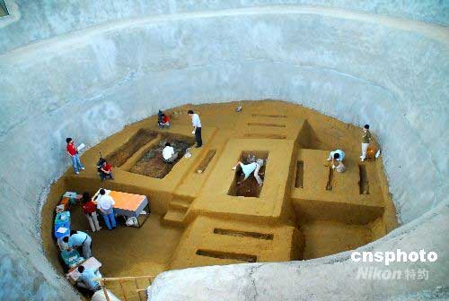 2008年6月15日,安徽省蚌埠市双墩一号墓发掘现场。从2006年12月开始,安徽省文物考古研究所展开对双墩1号墓的发掘,目前已接近尾声。据考古专家论证,春秋时期钟离国在安徽省蚌埠和凤阳一带,今天的“钟离”和“钟”姓,一说即来源于该国。钟离国是春秋时期的一个小国,蚌埠双墩一号墓位于“钟离城”遗址不远,从墓葬规模和陪葬物品等种种迹象表明,这个奇特的超级大墓,极有可能就是当时钟离国的国君。目前发掘工作仍在进行。中新社发 从启 摄