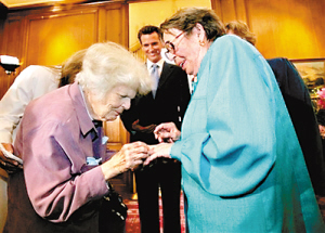 本报综合报道 在旧金山,市长加文·纽瑟姆在他的办公室内为一对同性恋老妇──87岁的德尔·马丁和83岁的菲利斯·里昂主持婚礼。她们是在旧金山市政厅宣读誓言的第一对同性恋夫妇。她们一同生活已经56年,现在终于领到结婚证了。在2004年,她们也举行过一次婚礼,成为新闻人物,但法庭其后宣布婚姻无效,她们现在决定再来一次。2004年她们的第一次婚礼也是由加文·纽瑟姆主持。