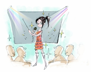 她一身时髦装束:深紫色连衣裙,又大又长的项链和耳环,一直到膝盖的白色长靴,头上戴着耳麦。这身行头不由得让人联想到在舞台上演出的歌手,而她是来上课的英语老师。