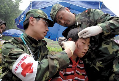 □5月16日,绵阳安县,来自上海长征医院的救援队员为受伤的孩子医治。