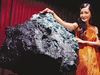 资料图:港姐杨洛婷在香港抱趣堂艺术馆内向传媒介绍绿宝石原生矿。当日,该馆展示法国留尼旺岛开采出来的,一个重达五百三十六公斤,长达一百二十五厘米,阔七十八厘米及高五十五厘米的绿宝石原生矿。据称,该矿石是目前世界上最大的宝石原生矿。中新社发 洪少葵 摄