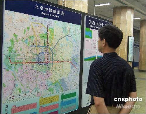 6月19日,北京地铁全线开始更换新的线路图,即将开通的10号线、8号线(奥运支线)和机场线登上新线路图。新线路图以北京地图作为底衬,用8种颜色表明8条地铁线路。其中10号线为浅蓝色,奥运支线为绿色,机场线为灰色。中新社发 九州 摄