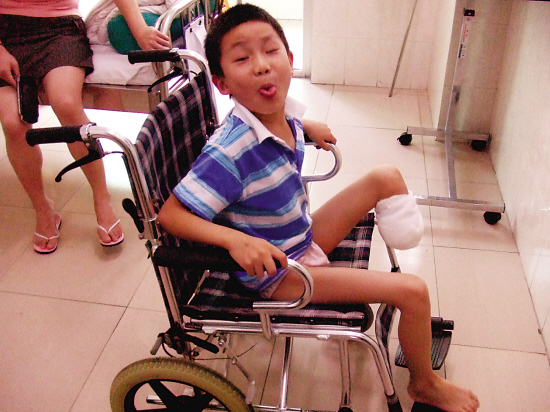 本报日前把热心市民捐赠的两张轮椅送到广州军区广州总医院。其中一张轮椅是儿童用的,便送给了8岁的截肢儿童张雨恒。另一张轮椅是成年人用的,但只有10岁的截肢儿童周乐训坐上去,那张轮椅显得过宽过高,很不合适。