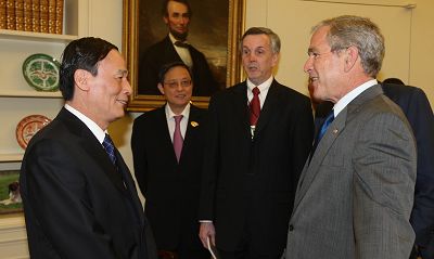 6月18日,美国总统布什在华盛顿白宫会见中国国务院副总理王岐山。新华社 图