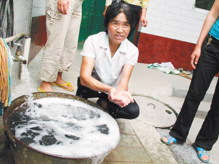 昨天上午,记者接到五星村二组村民反映的上述情况后,来到村民田红英家。在田红英家的水缸中,记者看到缸内的水呈黄褐色,底部沉淀着一层黄色的絮状物,田红英拿出自家的脸盆,白色的脸盆周边已经被侵蚀成黄色,连擦洗都很难。随后记者又来到石桃英家,“我家的井水抽上来全是臭的”,说着石大妈打开水泵,很快井中的水就哗哗地被抽了上来,流进了大铝盆内,不一会儿,水面上泛起一层白色的泡沫,“你看,这水就像撒了洗衣粉一样,漂了一层泡沫”,铝盆内蓄的水泛起阵阵刺鼻的臭味,一旁的村民纷纷捂鼻。