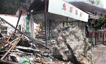 昨日上午,记者来到九龙沟,在挂有省级风景名胜区的大门一侧山腰上,一块足有货车大的巨石从一个农家乐碾过,留下废墟和一地碎石、树枝。门口已拉起红线,震后一个多月,九龙沟目前仍闭山谢客。