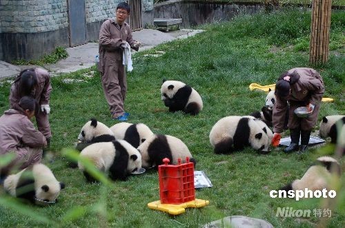 四川大地震过后月余,位于重灾区卧龙的中国保护大熊猫研究中心的大熊猫生存依旧艰难,无家可归的研究中心员工在极为艰难的条件下每天精心呵护着“幼儿大熊猫”。目前,通往卧龙的西线公路9月末将被大雪封闭,东线经过大地震震中映秀到达成都的公路短期内无法恢复。中新社发 江湖 摄