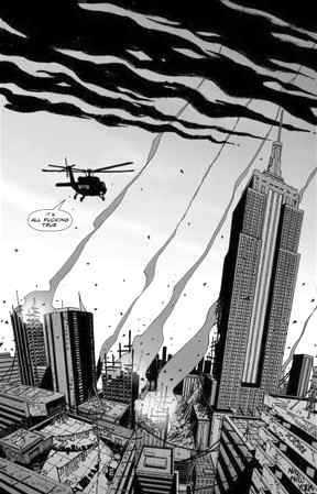 这是一部漫画的开头,作者是纽约人布莱恩·伍德。这部名为DMZ的漫画是反映伊战的漫画代表作之一,创作于2005年,下月还将出版新编版本。在这部漫画里,伍德通过马蒂·罗斯的所见所闻,描述了一个战争中的城市——讲述了一个束手无策和进退两难的记者逐渐了解并爱上DMZ及当地居民的故事。故事发生在纽约,讲述的是美国内战。但从另一个角度看,这个故事也反映了现实世界中另一个城市的战争——巴格达。