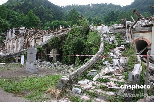 属全国重点文物保护单位的上书院坐落在四川彭州市白鹿镇,由法国传教士在1908年修建而成,用于培养中国天主教神职人员。1949年以后,上书院基本不再发挥宗教场所功能。在汶川大地震中,这座百年遗迹在短短8秒钟内全面坍塌,瓦砾成堆,木柱交错,通体白色的石质大门断裂成梯形,粗壮的半圆柱形门柱只有底部尚存。